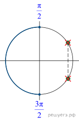 Отберём корни при помощи тригонометрической окружности (см. рис.). На заданном промежутке корней нет.