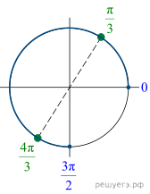 Отберём корни при помощи тригонометрической окружности (см. рис.). На заданном промежутке лежат корни: